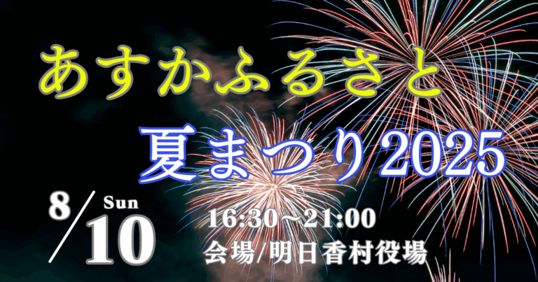 奈良県明日香村で、毎年多くの来場者を魅了する恒例イベント「あすかふるさと夏まつり2025」が、令和7年8月10日(日)16:30〜21:00に開催されます。今年も、村役場周辺がにぎやかな夏の夜に変わります。