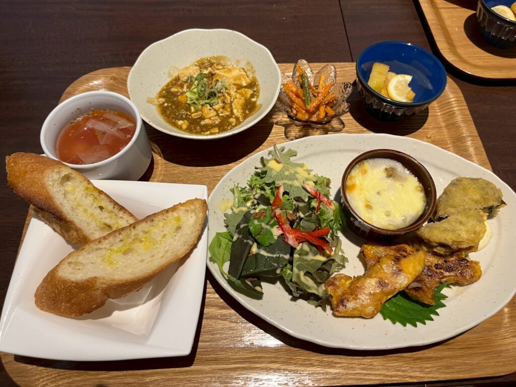 今回いただいたのは「ワンプレートランチ:¥1,600円(税込)」。一皿に季節の野菜を使った創作料理や手作り豆富料理など、9種類の小皿が彩りよく並びます。色鮮やかで、どれから食べようか迷ってしまう楽しさがあります。ごはんかパンを選ぶことができます。この日はパンをセレクトしました。パンはパリッとしておりとても美味しかったです。