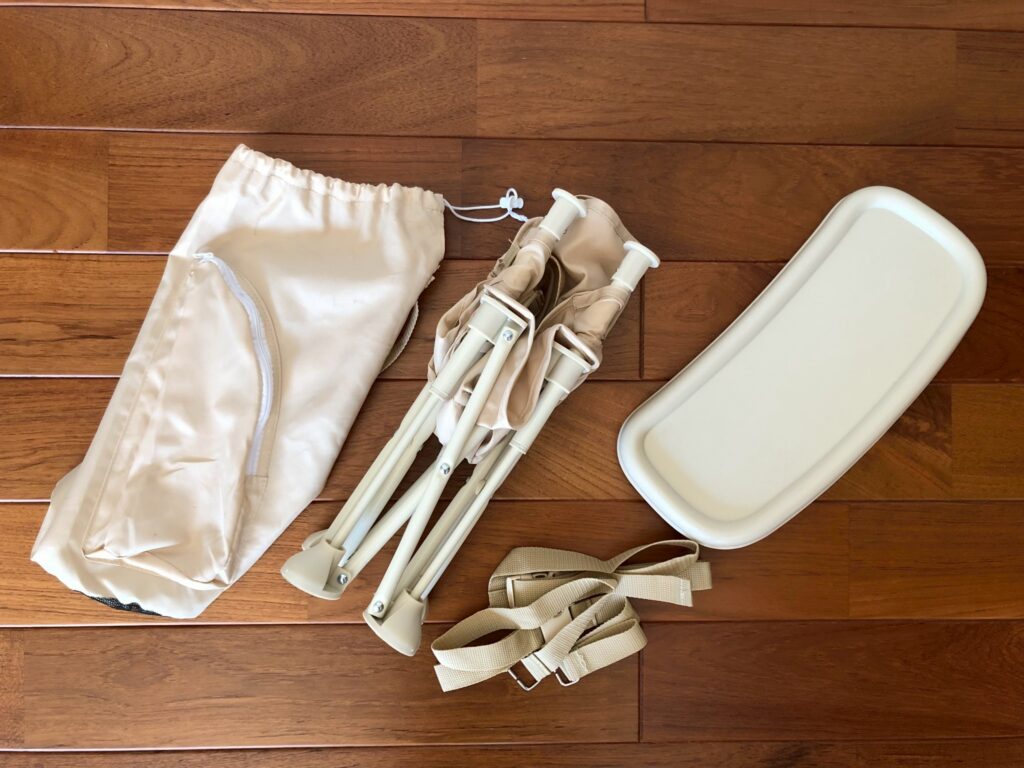 袋には、椅子とテーブル、ベルトが入っています。このベルト、大人の椅子の上にこの子ども椅子をのせる時に、固定するためのベルトとのこと。うちはまだ使ったことはないですが、固定できると安心感が違いますよね。