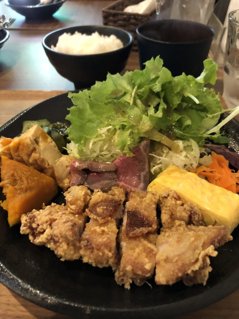 ボリュームたっぷりの唐揚げに、ローストビーフ、卵焼き、野菜3品(この日は、にんじんラペ・きゅうりの酢の物・かぼちゃと厚揚げの煮物)、たっぷりのサラダとお吸い物がついてきます。