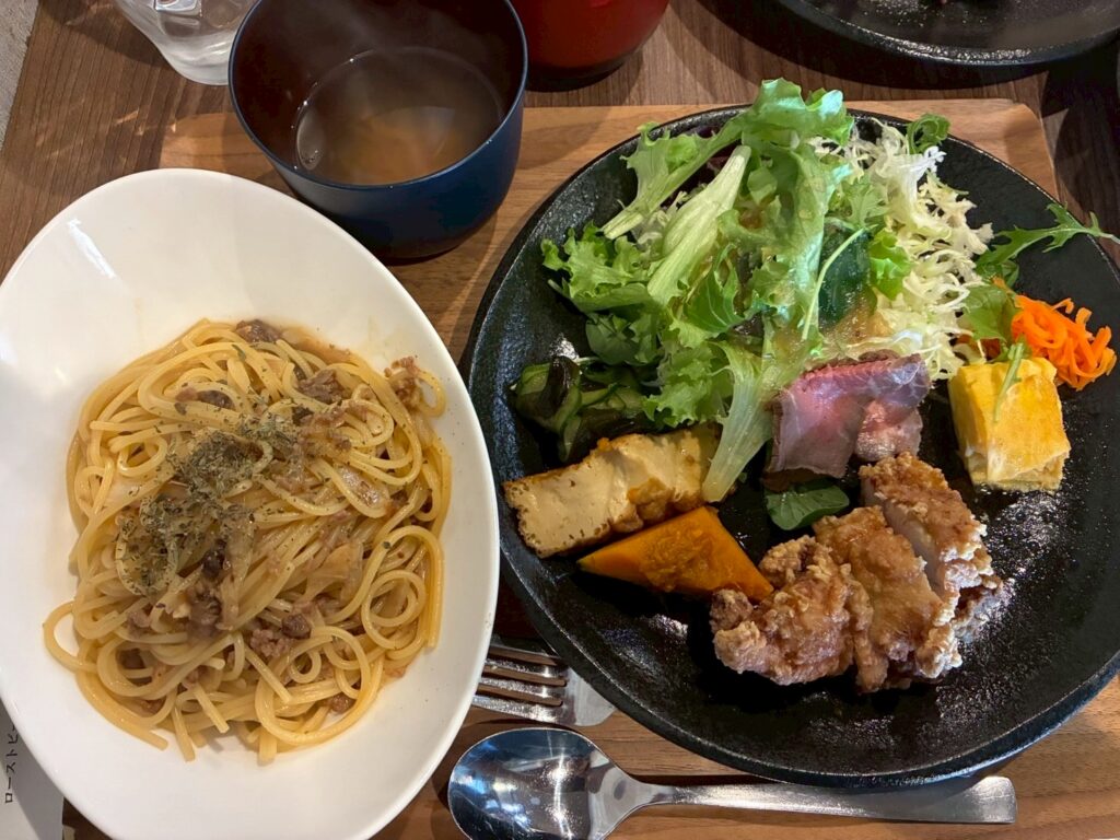 同じくプライムリブランチのパスタセットです。ペペロンチーノそぼろを選択。ごはんセットよりさらにボリュームがあり、そぼろもニンニクがきいた甘辛味で、がっつり食べたい方にオススメです!子供も食べやすい味で、娘もぱくぱく食べていました。