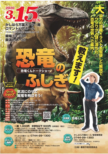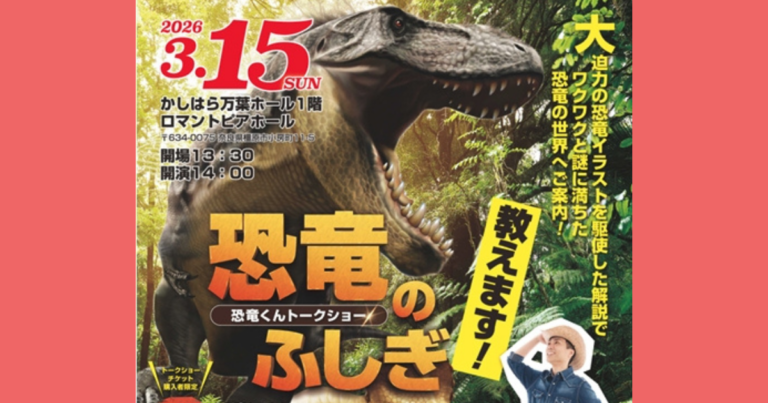 「恐竜くんトークショー 恐竜のふしぎ教えます!」が、2026年3月15日(日)に かしはら万葉ホール で開催されます。